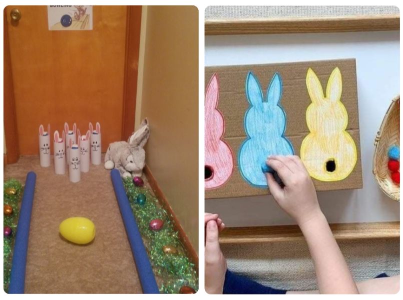 Maak van lege toiletrollen of keukenpapierrollen paashaaskegels door op de rollen met wit papier witte tandjes en paashaasoren te plakken. En laat je kleine de kegels omverrollen met plastic ballen/paaseieren.