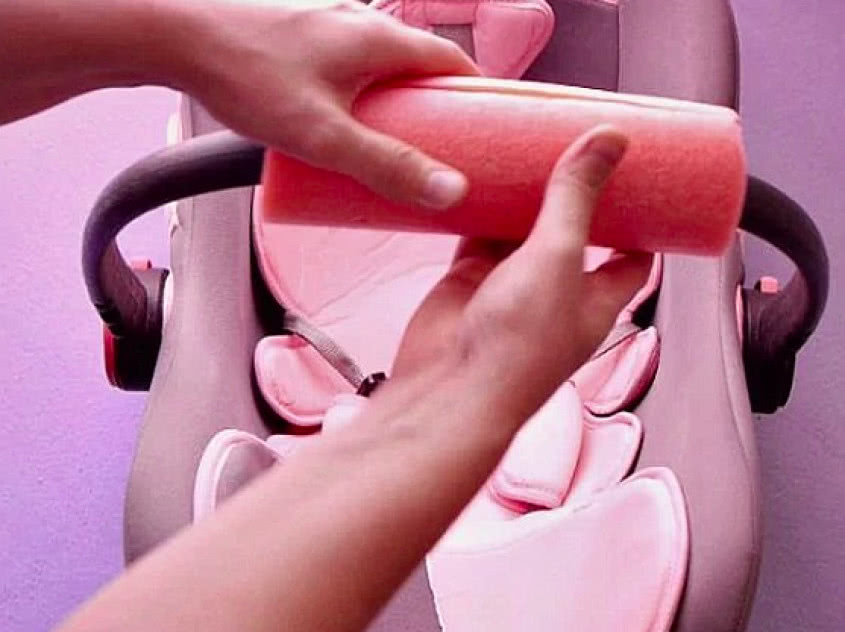Het dragen van je maxi-cosi om je onderarm kan pijnlijk zijn. Knip een stuk van een schuimrubberen zwembadslang af om de hendel wat zachter te maken.