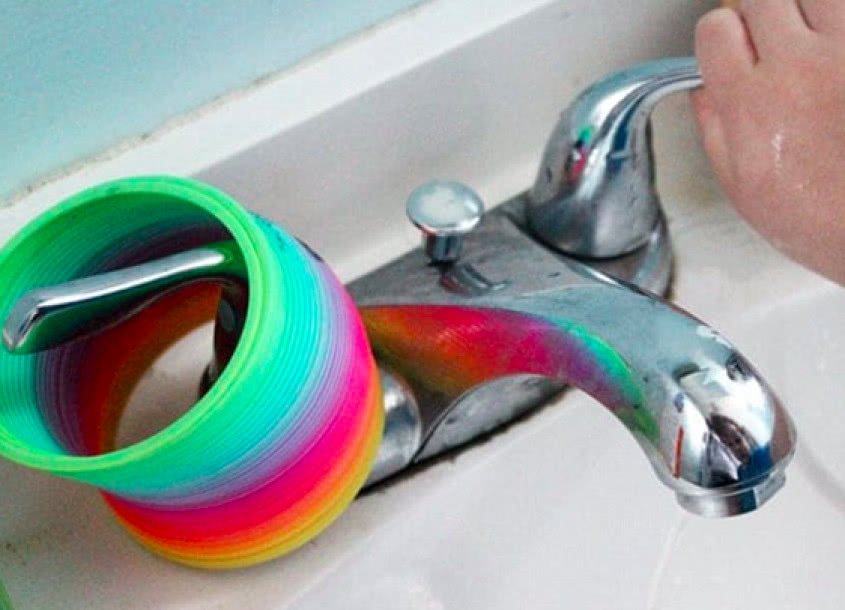 Wat is de warmwater- en wat de koudwaterkraan? Door een trapspiraal om de warmwaterkraan te doen, kan je kind zich niet meer vergissen.