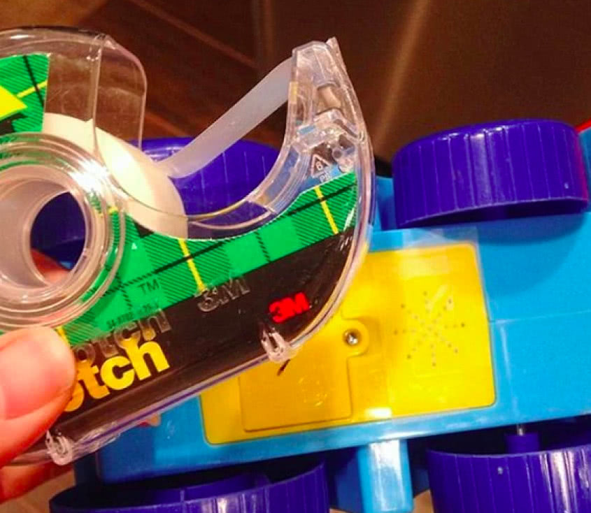 Leuk hè dat speelgoed dat geluid maakt. Soms word je er helemaal gek van. Als het niet mogelijk is om het geluid wat zachter te zetten, plak een plakbandje over de plek waar het geluid uitkomt om het wat te dimmen. Beter zo!