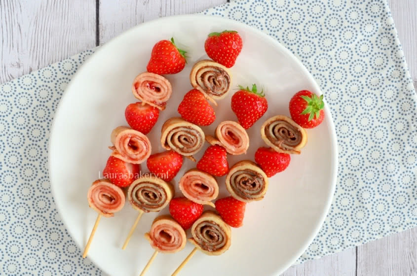 Toegegeven, het kan gezonder. Maar met deze pannenkoekenspies van Laura's Bakery, waar je slechts een paar stukjes op prikt, tussen wat stukjes fruit, ziet er super leuk uit, is ontzettend makkelijk te maken én gaat zeker punten scoren bij de kleintjes. Wie houdt er niet van fruit en pannenkoeken? Dat we dit niet zelf bedacht hebben! ;-)