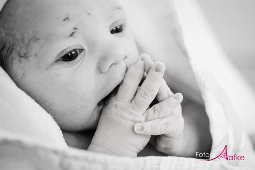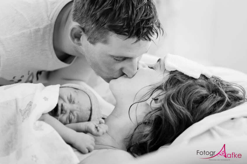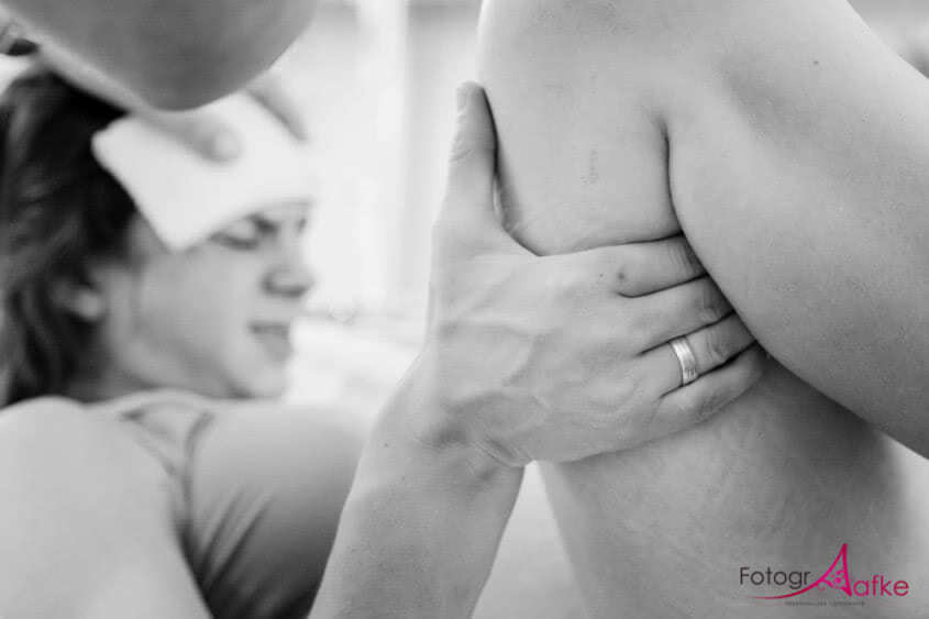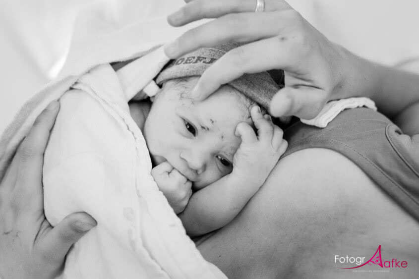 Marjolein besluit lekker onder de warme douche te gaan zitten. Als ze dan niet in bad de weeën op kan vangen hoopt ze dat een warme douche het wat zachter maakt en in ieder geval de pijn in haar rug wat verzacht. Na 40 minuten heerlijk onder de warme douche te hebben gezeten, komt ze onder de douche weg. Je ziet dat het nu echt heel veel moeite kost om de weeën op te vangen. Om 02.20 uur constateert de verloskundige tijdens een controle dat er zes centimeter ontsluiting is. Om het kindje goed de kans te geven verder het bekken in te zakken gaat Marjolein op haar rechterzij liggen en vangt zo de zware weeën op. Danny is bezorgd en tegelijk enorm trots op zijn vrouw, ze doet het toch maar mooi helemaal zelf! Om 03.00 uur geeft ze duidelijk aan dat ze een drukgevoel voelt, maar ze houdt dapper vol. Totdat ze het echt niet meer kan en ze om 03.08 uur mee mag persen. Dit is wel heel spannend, omdat ze bij de vorige bevalling 2,5 uur heeft geperst, maar wat doet ze het goed. Op den duur zegt de verloskundige dat hun mannetje er bijna is, maar Marjolein gelooft dat niet zo. Om zijn woorden kracht bij te zetten laat hij Marjolein het hoofdje van haar mannetje voelen en dan gelooft ze het echt! Wat een opluchting! Ze doet nog enorm haar best en om 3.26 uur wordt hun prachtige zoon Finn geboren. Een prachtig helder en wakker mannetje van 3625 gram en 51 cm met inimini vingertjes en teentjes. Wat zijn ze trots op hun mannetje en elkaar. Ze hebben het maar mooi zelf gedaan.