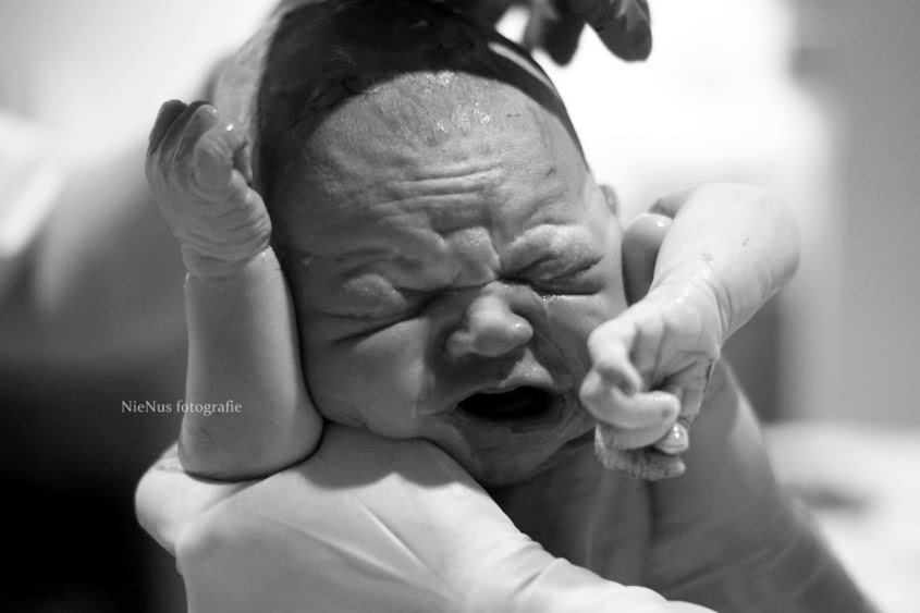 “Onze wens was om in het ziekenhuis te bevallen dus het was heel fijn dat we in alle rust die kant op konden rijden. In het ziekenhuis hebben ze rond 16.00 uur mijn vliezen gebroken. Vanaf toen keerde ik helemaal in mezelf, sloot mijn ogen en heb ze eigenlijk pas weer open gedaan toen hét moment daar was. Complete concentratie, de hele tijd”.