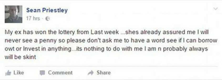 Nadat Beverly de sociale dienst had gebeld om haar uitkering stop te zetten, besloot ze direct om nóg een telefoontje te plegen: eentje naar haar ex-man. Die plaatste daarna een niet mis te verstaan berichtje op Facebook. ,,Mijn ex heeft de lotto gewonnen vorige week en ze heeft me verzekerd dat ik er geen cent van zal zien. Vraag me dus ook niet om een lening of om ergens in te investeren. Ik ben platzak en ik zal dat altijd zijn."