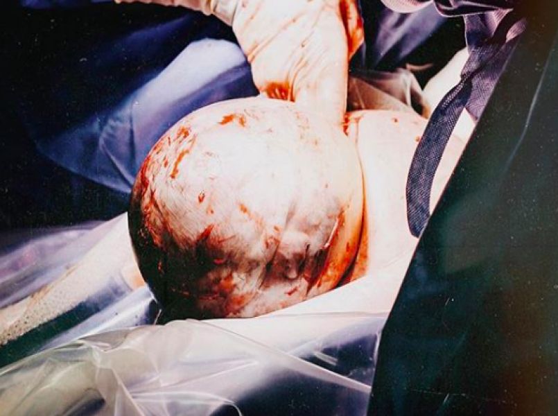 “Toen ze haar uit haar buik trokken, zag ik een bobbel eruit komen en in eerste instantie dacht ik dat het een gedeelte van Rachaels binnenkant was. Maar ik wist dat het vreemd was, omdat ik dit eerder de keizersnede van mijn zoontje 17 maanden eerder had meegemaakt en toen zag ik dit niet.”