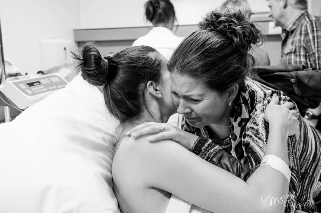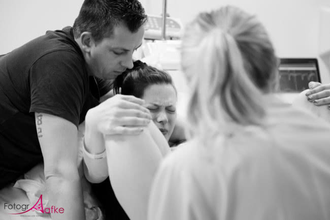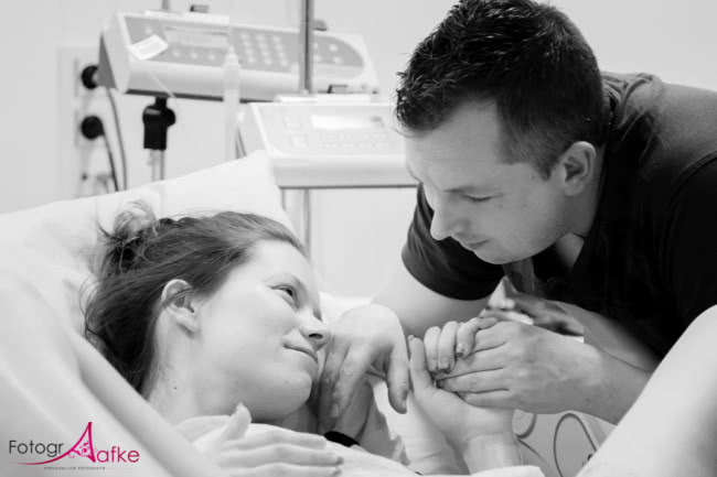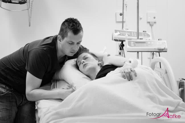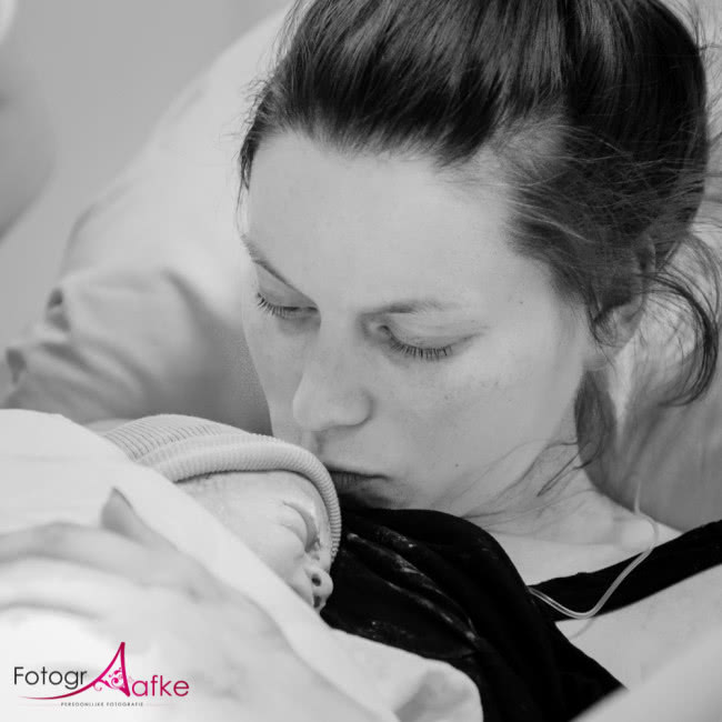 Toen ik binnen kwam lag Petra er rustig bij en konden we even praten over wat er tot nu toe allemaal al gebeurd was. Petra werd bijgestaan door Martijn, één van haar zussen en haar moeder. De sfeer was heerlijk ontspannen en rustig, in tegenstelling tot eerder die ochtend vertelde Petra. Ze had hele sterke weeën gehad en Martijn zijn hand helemaal fijn geknepen. Het was zo heftig dat er besloten werd een ruggenprik te zetten en die deed gelukkig goed zijn werk.