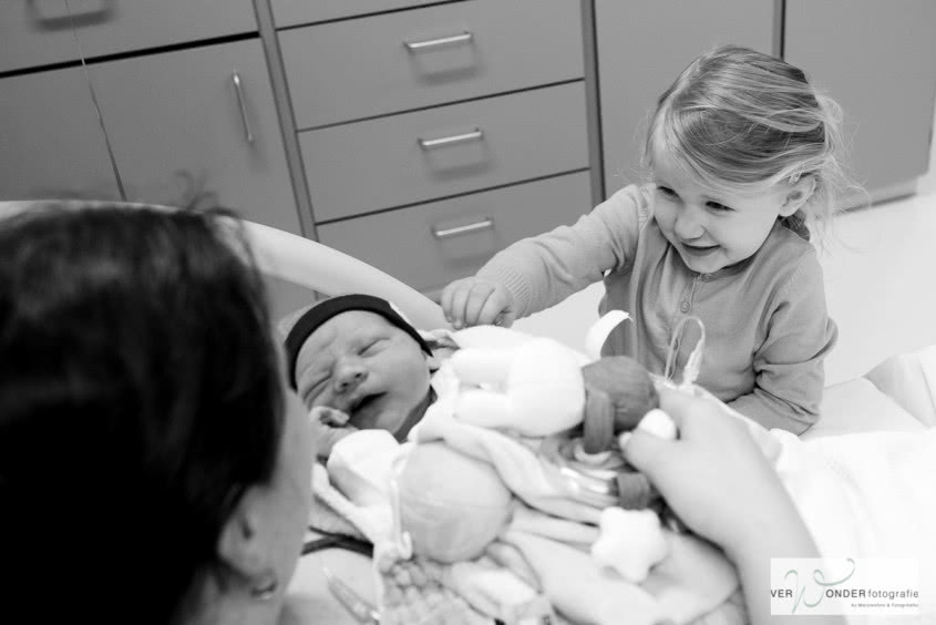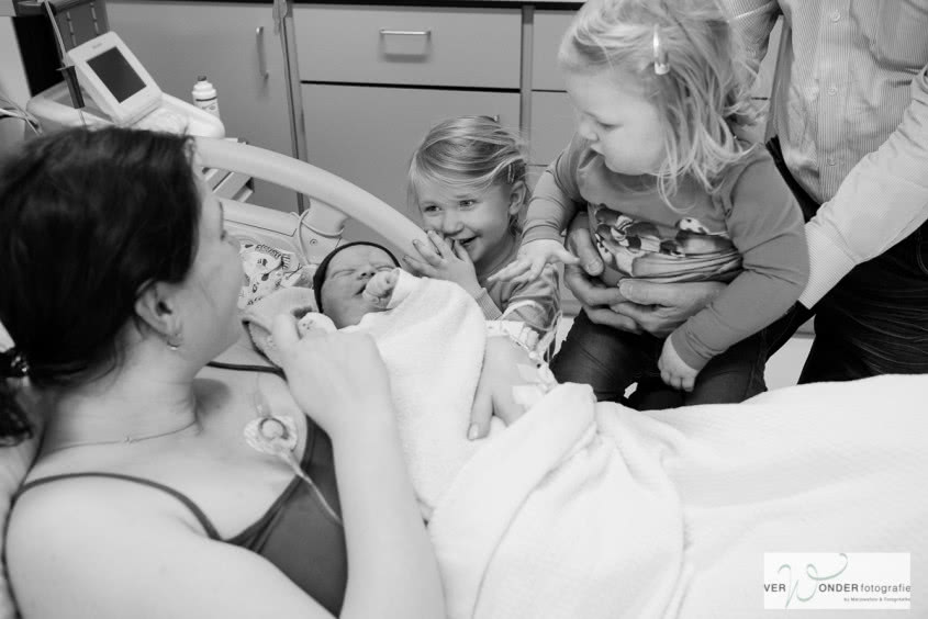 Dyami doet het ontzettend goed en wordt door zowel Tamara als Dennis flink bewonderd. Nadat hij zijn eerste setje kleertjes aan heeft en de controles zijn gedaan staan er twee trotse grote zussen te popelen om hun broertje te mogen bewonderen. Met een mooie ballon komen ze de verloskamer binnenwandelen. Ze hebben cadeautjes meegenomen voor hun broertje en die vindt het ook wel enorm interessant. Wat zal hij op handen worden gedragen door zijn twee trotse zussen!