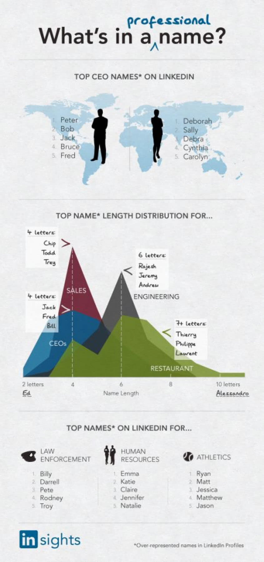 Uit onderzoek van LinkedIn uit 2011 blijkt dat mannen met korte namen vaker succesvol zijn in het zakenleven dan mannen met lange namen. Hoe minder lettergrepen een naam bevat, hoe hoger de positie van de man. LinkedIn klustte er een leuke infographic bij waarin te zien is welke namen populair en succesvol zijn in welke branche. In Nederland verschilt dit enigszins, maar is Cees de populairste naam voor mannen met het hoogste aanzien. Wij zouden het fijn vinden als er ook naar vrouwennamen binnen topfuncties gekeken wordt, maar dat is bij deze onderzoeken nog niet het geval.