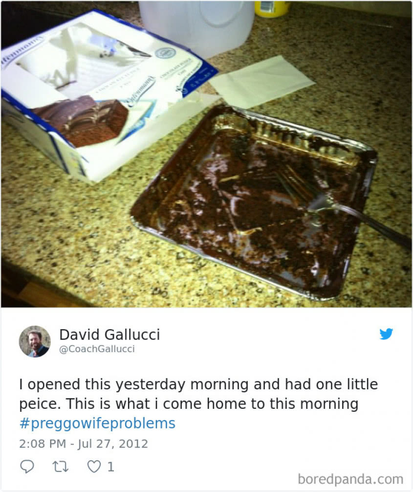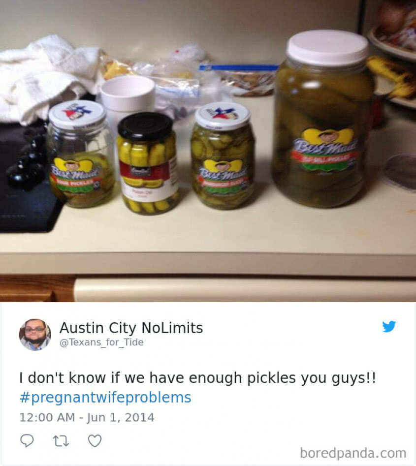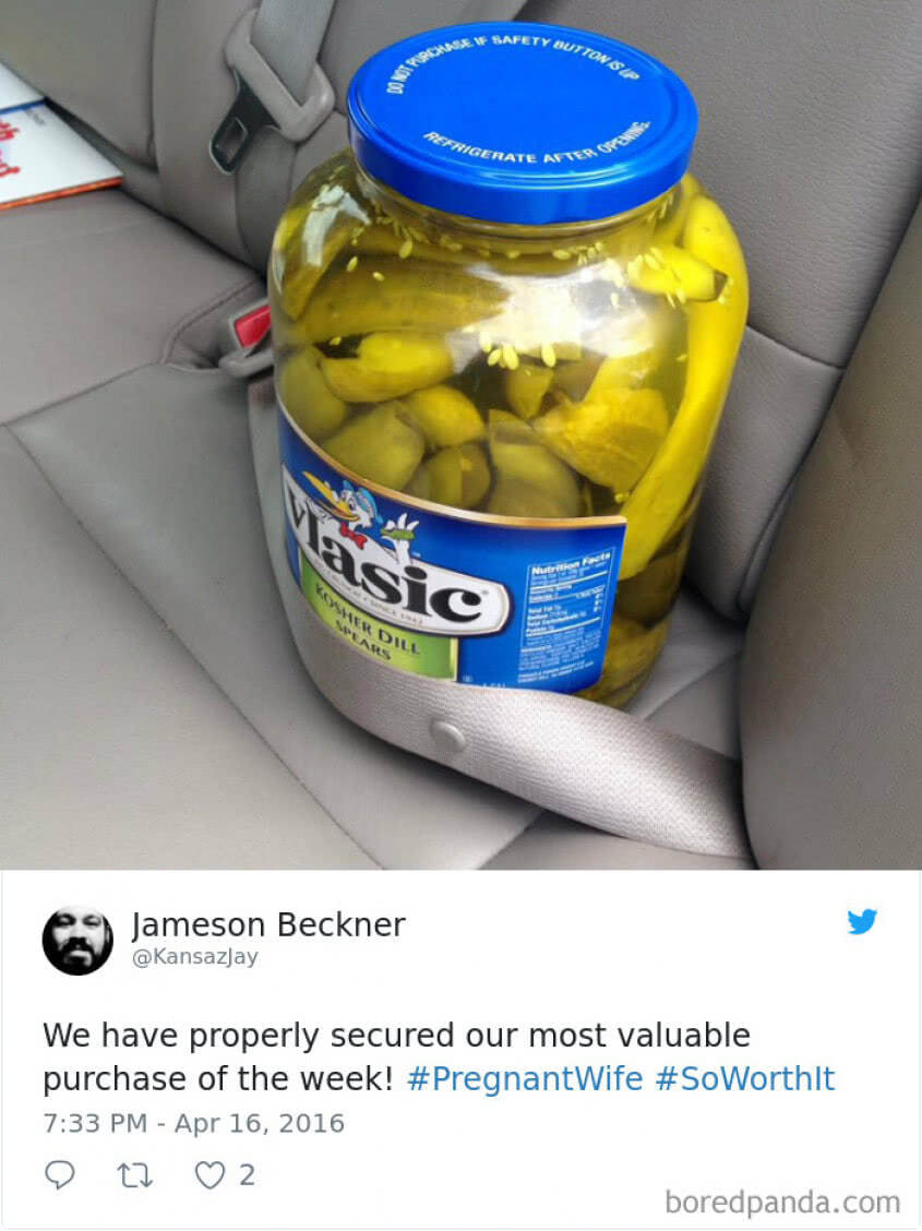 Bij mijn eerste zwangerschap had ik in de laatste weken trek in hele vreemde combinaties: zoals Bosche bollen met een broodje haring. “Niet vragen waarom, maar gewoon halen”, riep ik dan. En bij mijn tweede zwangerschap kon ik niet buiten vanille vla. Hele pakken gingen er doorheen. Ook deze mannen krijgen nu hun partner zwanger is de raarste verzoeken. Ze deelden het op social: