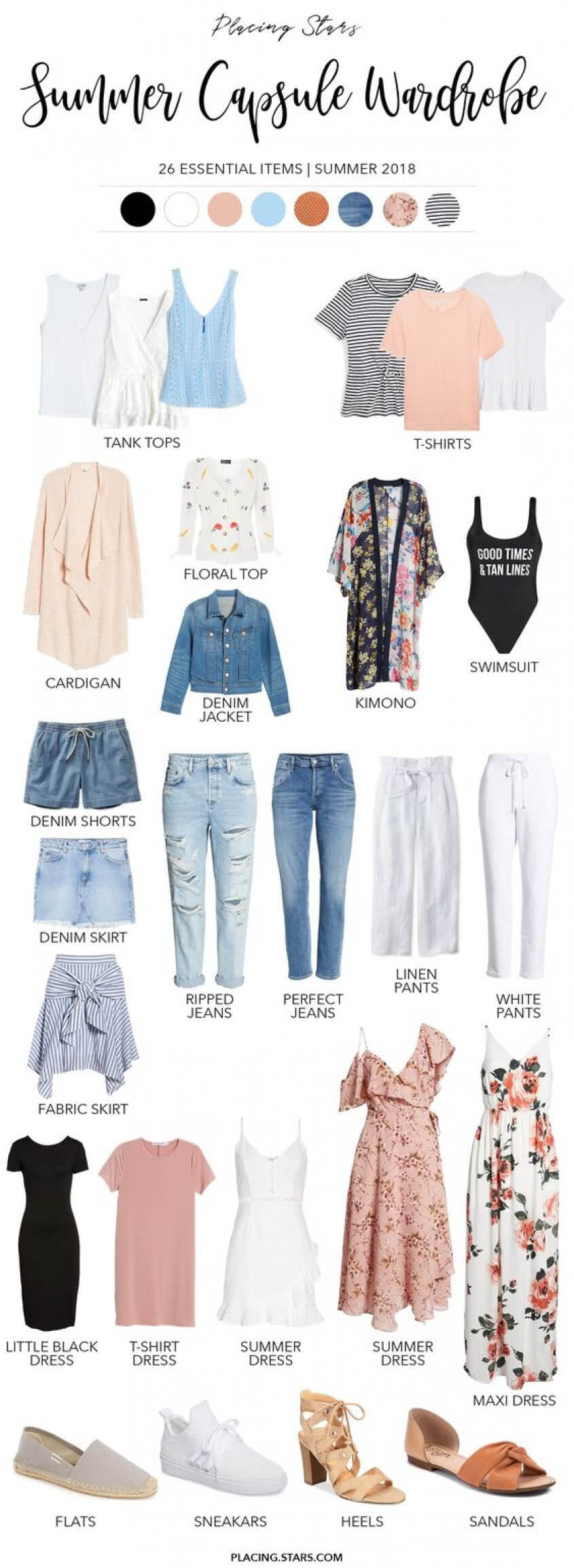 Hoe je de capsule wardrobe samenstelt, is helemaal aan jou. Je hebt je eigen stijl en eigen favoriete items. Op Pinterest staan veel inspiratiebeelden van hoe een capsule wardrobe eruit kan zien. Hieronder zie je een voorbeeld van een zomer capsule wardrobe.