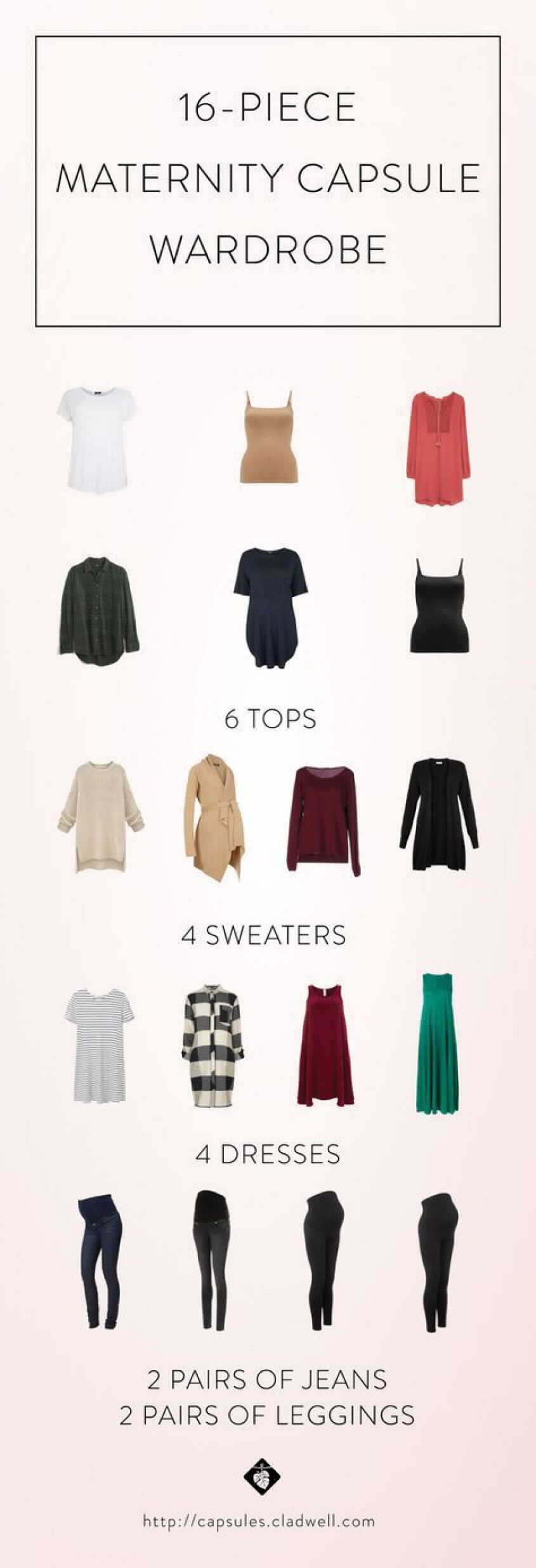 Als je zwanger bent, is kleding uitzoeken al extra lastig. Veel vrouwen vinden niks leuk staan. Ook tijdens je zwangerschap kun je een capsule wardrobe samenstellen. Zo weet je in ieder geval zeker dat je niets teveel koopt. Deze garderobe kan bijvoorbeeld bestaan uit twee zwangerschapsbroeken, een legging, een vest, een trui, vijf t-shirts/tops, een rok, drie jurken, een jas en vier paar schoenen. Of je kunt de afbeelding hieronder als voorbeeld nemen!