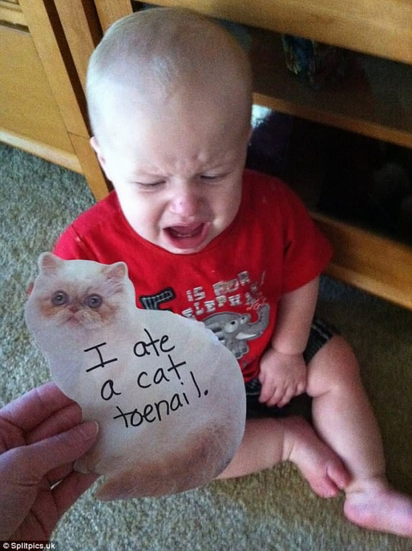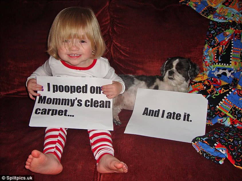 Baby en jonge kinderen kunnen niet echt dingen doen waar je heel boos om kunt worden, maar ze kunnen wel dingen doen die je mateloos kunnen irriteren. Nu heeft een aantal ouders online foto’s geplaatst waarop hun kind een karton vasthoudt met daarop hun ‘stoute’ daad: