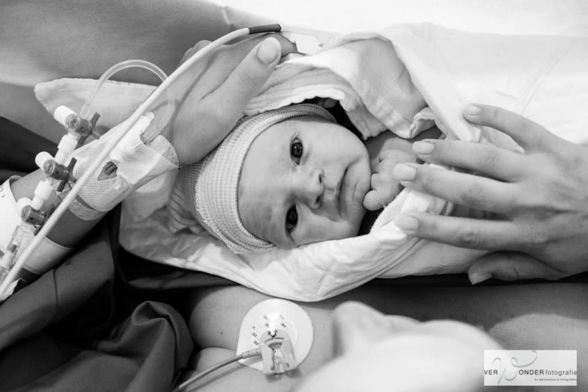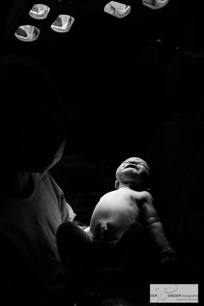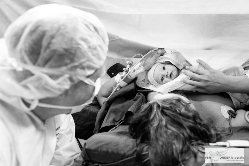Het bijzondere is dat exact hetzelfde team als bij Rowan weer aan het bed staat. Ze hebben mij al eerder aan het werk gezien en ze weten hoe belangrijk de foto’s voor Antoinet en Kevin zijn. Ik loop mee richting de O.K. en daar krijgen we definitief te horen dat ik mee mag. Ondanks de weeën zie ik een dankbare blik van Antoinet en samen met Kevin doen we onze O.K.-pakken aan. Wat ben ik blij met de workshop geboortefotografie van Marry Fermont waarin het fotograferen van een sectio uitgebreid aan bod is geweest. Met de nodige tips stap ik vol vertrouwen de O.K. in. Niet kort daarna begint het team aan de sectio en al snel wordt Hessel geboren. Wat een prachtig kereltje! Wat heeft hij een mooie geboortedag gekozen.