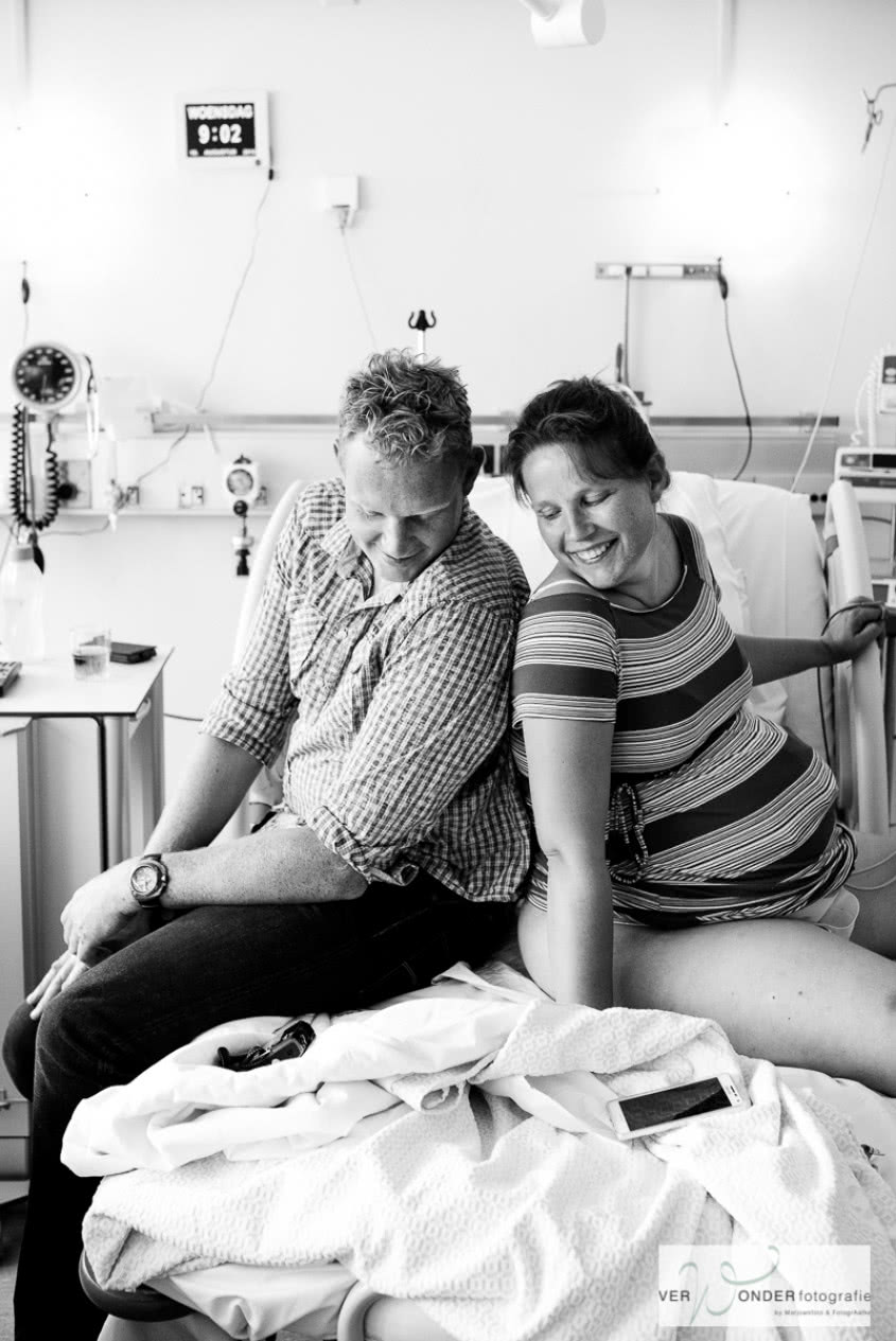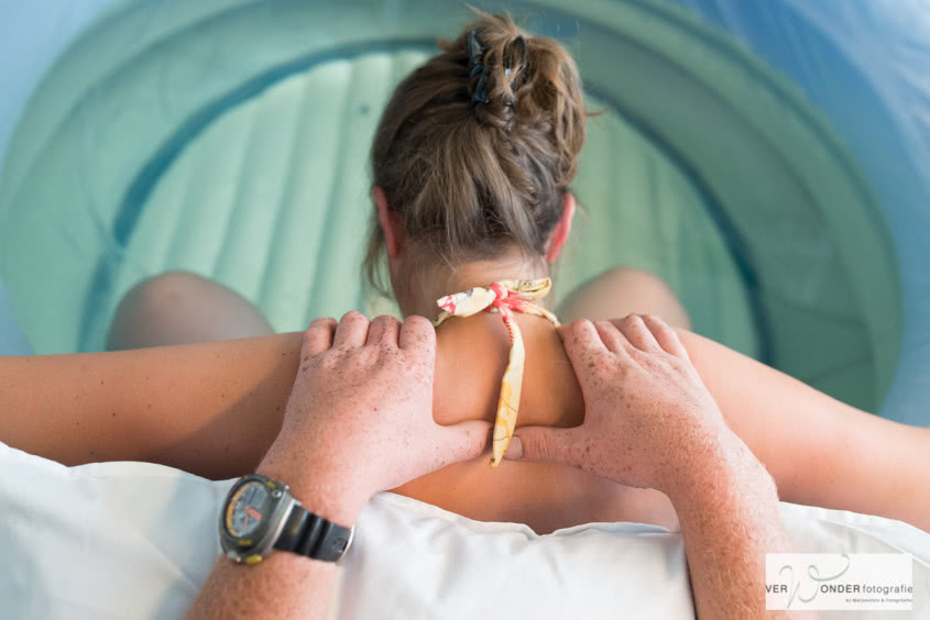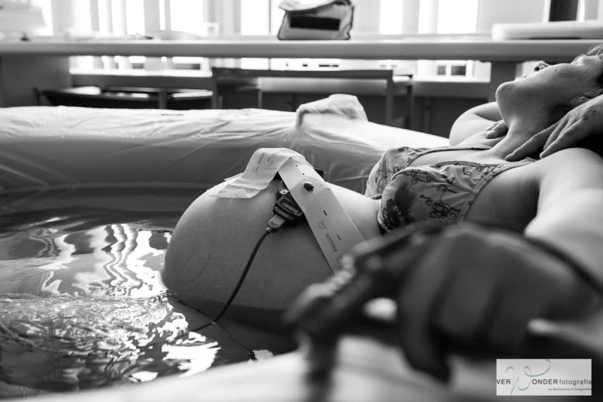 Als ik aankom in het ziekenhuis, zie ik dat Antoinet de weeën op aan het vangen is. De frequentie en kracht van de weeën lijken na mijn komst iets af te zakken. Als geboortefotograaf is het van groot belang om het geboorteproces te respecteren en ik besluit om beide ouders even alleen te laten en een tijdje in de koffiekamer in het ziekenhuis te zitten. De vliezen worden gebroken en de kleine blijkt in het vruchtwater te hebben gepoept. Halverwege de ochtend verhuist Antoinet naar het bevalbad en wat is het fijn voor haar om in het warme water de weeën op te vangen. Kevin steunt Antoinet waar nodig en zijn humor gaat geregeld door de kamer. De uren verstrijken en de ontsluiting vordert, waarna er halverwege de middag volledige ontsluiting is en de laatste fase van de bevalling kan beginnen.