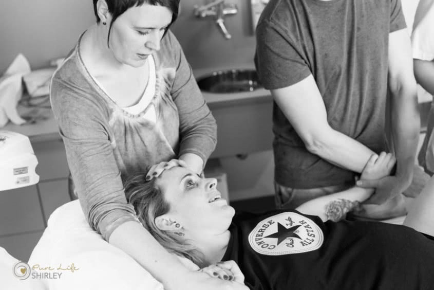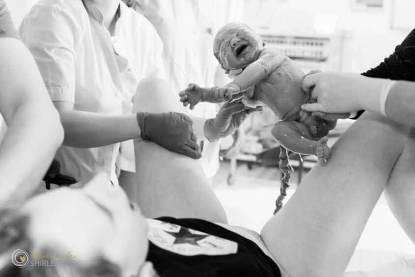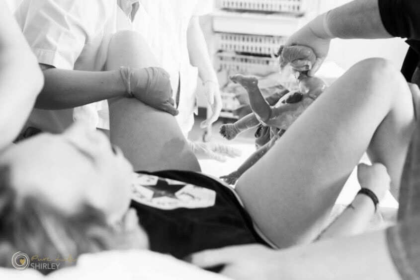 Om precies te zijn krijg ik om 07:55 uur mijn parkeerkaartje en ren letterlijk door het ziekenhuis heen naar de eerste verloskamer waar Stefanie net op haar rug draait om te gaan persen. Ik hoor Rick snel tegen me zeggen: “wat fijn! Je bent er!” WOW! Net op tijd dus...! Ik zie Stefanie met lichte paniek, het gaat haar allemaal wat te snel. Ze is nog maar net op de verloskamer en mag al gaan persen? Hoe kan dit? Haar zus en man helpen haar hier enorm goed doorheen en eigenlijk voor iedereen het door heeft is het zo ver.
