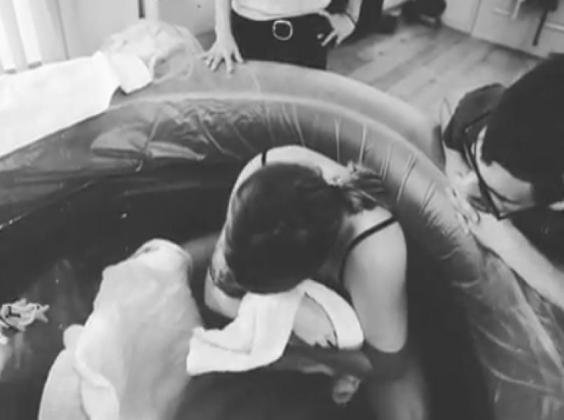 Het moment dat te zien is, is net na de bevalling als ze haar pasgeboren dochter blijft knuffelen, terwijl ze beiden nog in het bevallingsbad zitten.