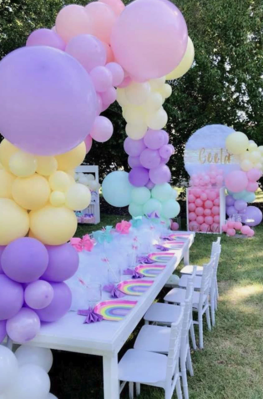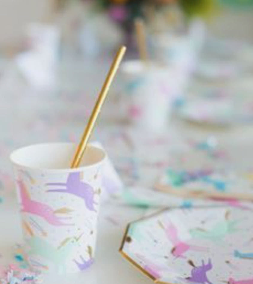 De versieringen kun je zo gek maken als je zelf wil. Van een aantal gekleurde ballonnen tot regenboogslinger met eenhoorn bordjes en bekertjes. Budgettip: witte bekertjes kun je ook zelf versieren met stickers.