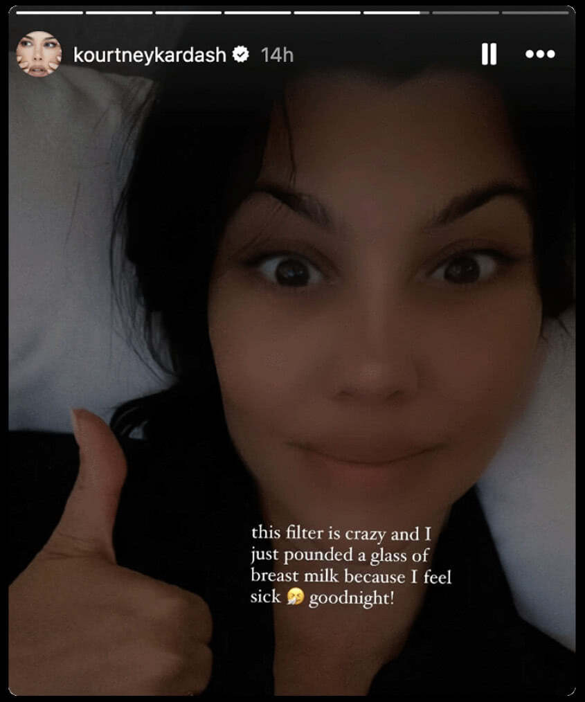 Wat kun je doen als je je niet zo lekker voelt? Kourtney Kardashian heeft een oplossing: het drinken van haar eigen borstvoeding, want als dat goed is voor het immuunsysteem van je baby, waarom dan niet voor jou? Ze plaatste er een story over op Instagram: