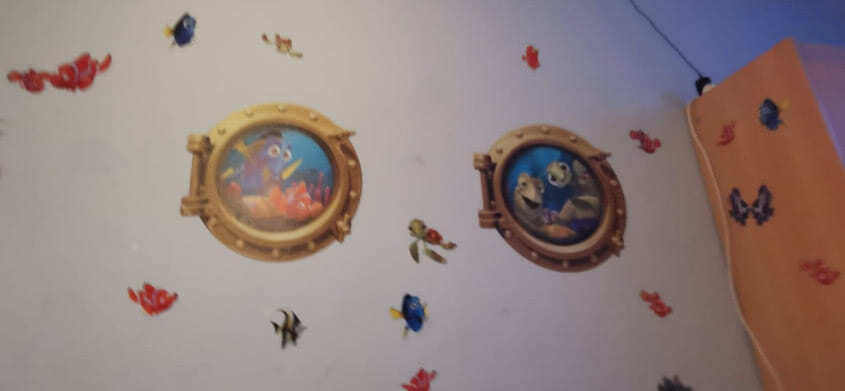De jongste heeft als thema Finding Nemo en daar heb ik niet een muurschildering voor laten maken, maar hele mooie, grote muurstickers voor besteld en boven zijn bedje geplakt.”