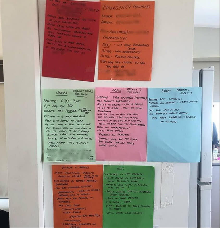 Een Australische moeder liet een hilarische vergelijking zien van het briefje dat zij achterliet voor de oppas en het briefje dat haar man achterlaat. In haar versie zie je een gedetailleerde beschrijving van slaap- en eetritme per kind. Haar man laat alleen een afgescheurd papiertje met noodnummers achter. Welk soort ouder ben jij?