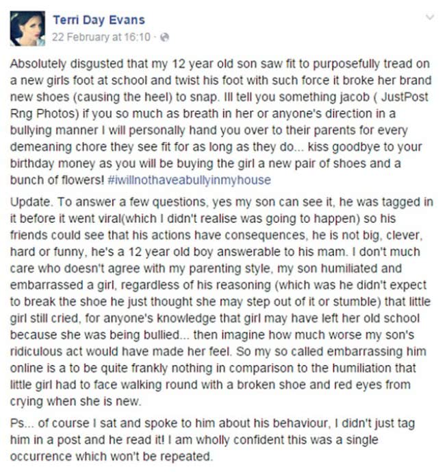 Facebook-bericht Zoon Jacob had expres op de voet van een nieuw meisje op school getrapt waardoor haar schoen kapot ging. Daardoor moest het meisje onwijs huilen, schreef Terri op haar Facebook-pagina. ‘Ik zal je wat zeggen, Jacob, als je zelfs maar op één pesterige manier in haar of iemand anders’ richting ademt, zal ik je persoonlijk naar hun ouders brengen om je alle nederige karweitje te laten opknappen’, schreef de moeder boos. ‘En je hoeft geen geld voor je verjaardag te verwachten, want je moet nog nieuwe schoenen en een bos bloemen kopen.’