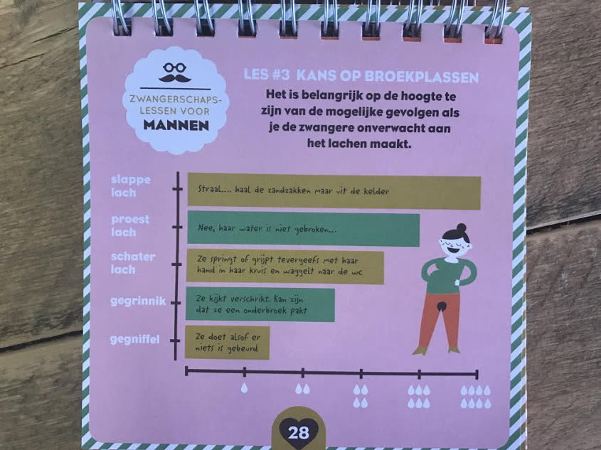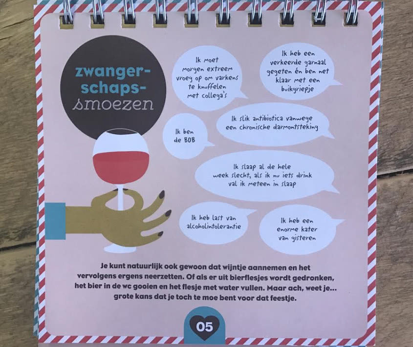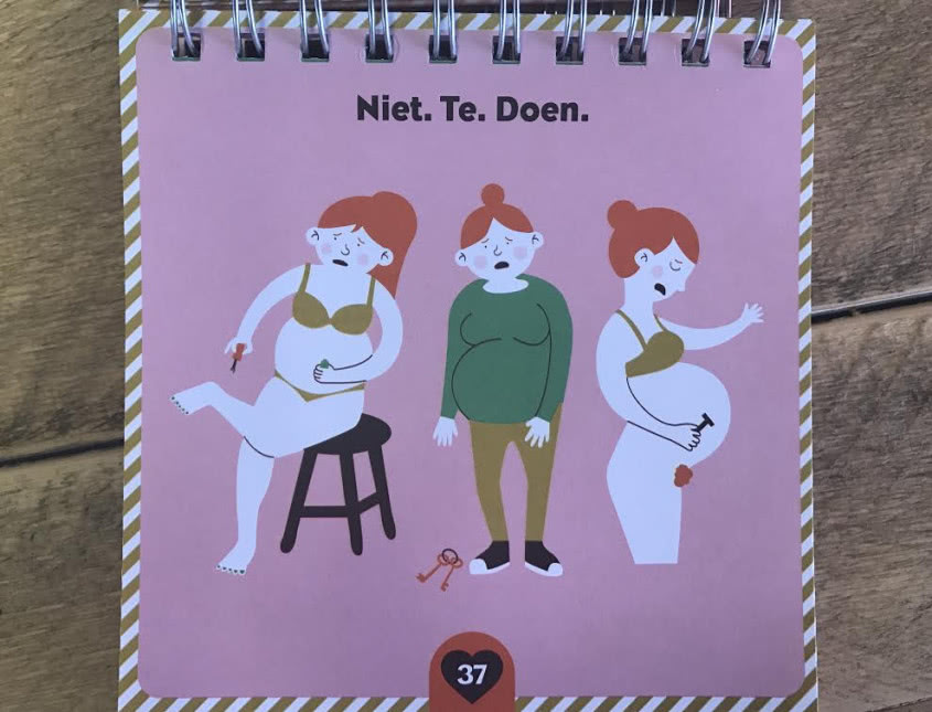 Ik weet dan ook zeker dat ik DOLgelukkig was geweest als ik tijdens mijn zwangerschappen de Relax Mama! Zwangerschapskalender in mijn handen had gehad. De kalender is te gebruiken vanaf week 1 van je zwangerschap, al is hij ook gewoon heel erg tof om door te bladeren als je al verder bent. Hij heeft een ringbandje en is handig rechtop op je bureau of je nachtkastje te zetten. Iedere week kan je een bladzijde omslaan waar een leuke - herkenbare! - tekening op staat en/of een stukje informatieve, en erg leuk geschreven, tekst op staat.