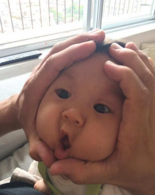Sommige baby's vinden het allemaal wel prima, dat geknutsel aan hun gezicht. Foto: Twitter