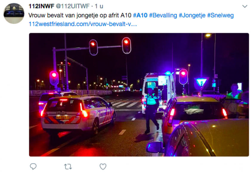 Dat overkwam een vrouw uit Amsterdam in de nacht van 19 op 20 september. Om 5.22 uur beviel ze van een kindje op een afrit van de A10. De vader vertelde dat ze eigenlijk naar het Boven het IJ-ziekenhuis wilden gaan, toen ze te horen kregen dat het daar vol zat. Ze werden doorverwezen naar het OLVG-West, maar dat was dus net even te ver. 200 meter voor het ziekenhuis kwam de bevalling op gang en werd het jongetje in de auto geboren. Moeder en zoon werden vervolgens naar het ziekenhuis gebracht en maken het inmiddels goed.
