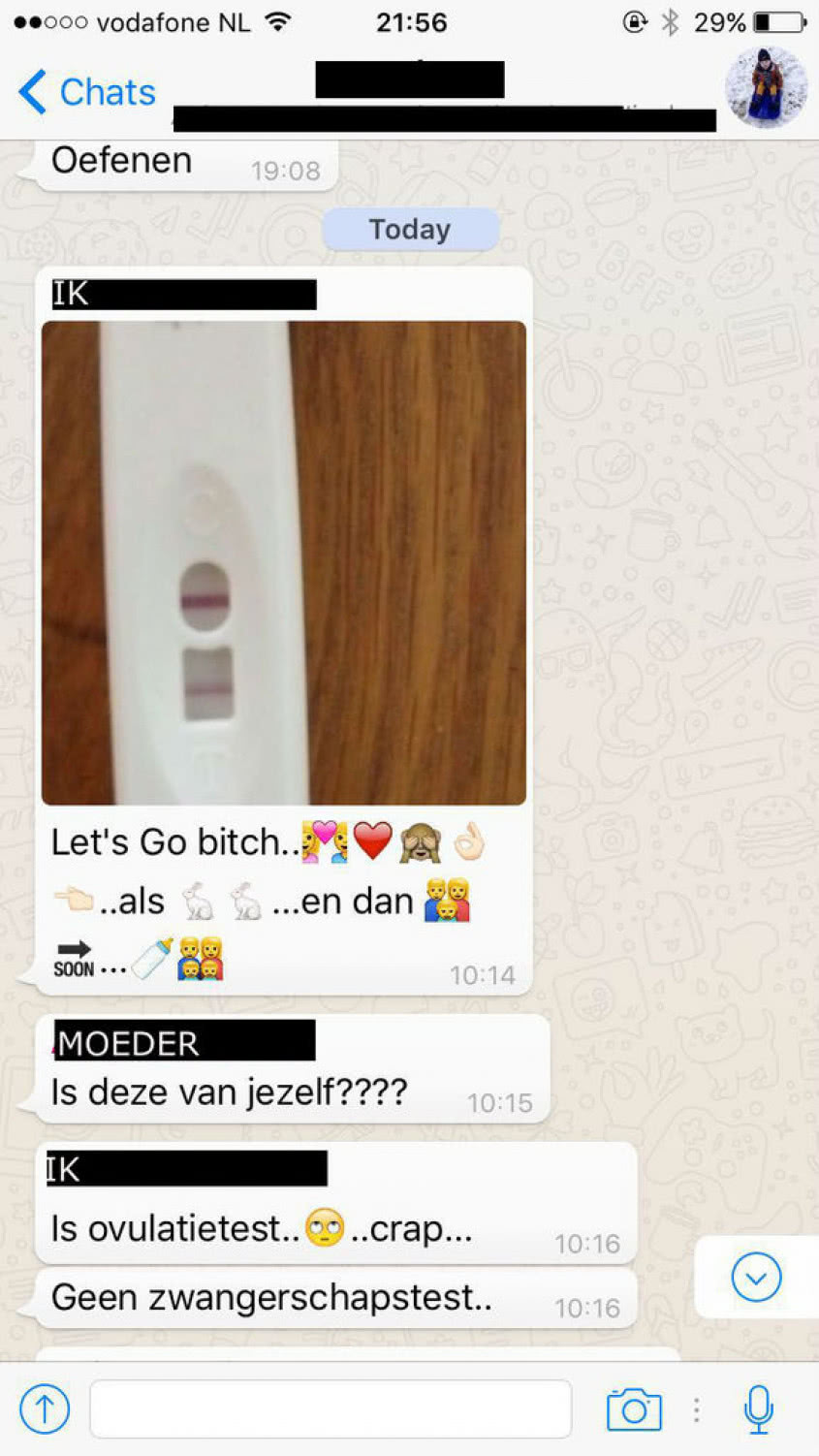 Binnen een luttele seconde reageert mijn moeder, die op haast symbiotische wijze vergroeid lijkt met haar telefoon en tot overmaat van ramp de ovulatie-test niet van een zwangerschapstest weet te onderscheiden. Shit... Shit... Shit..