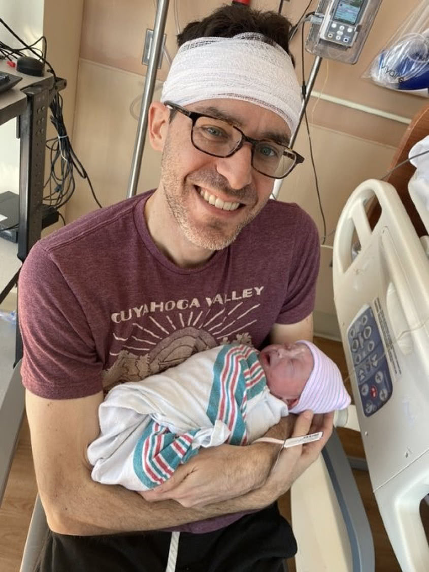 Op alle foto's met zijn pasgeboren baby staat Luke, schrijver van beroep, met een enorm verband om zijn hoofd in beeld. Hoe dat kwam? Dat vertelde hij op X. Dít is zijn verhaal: