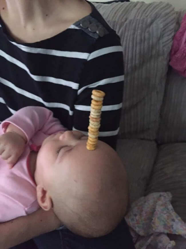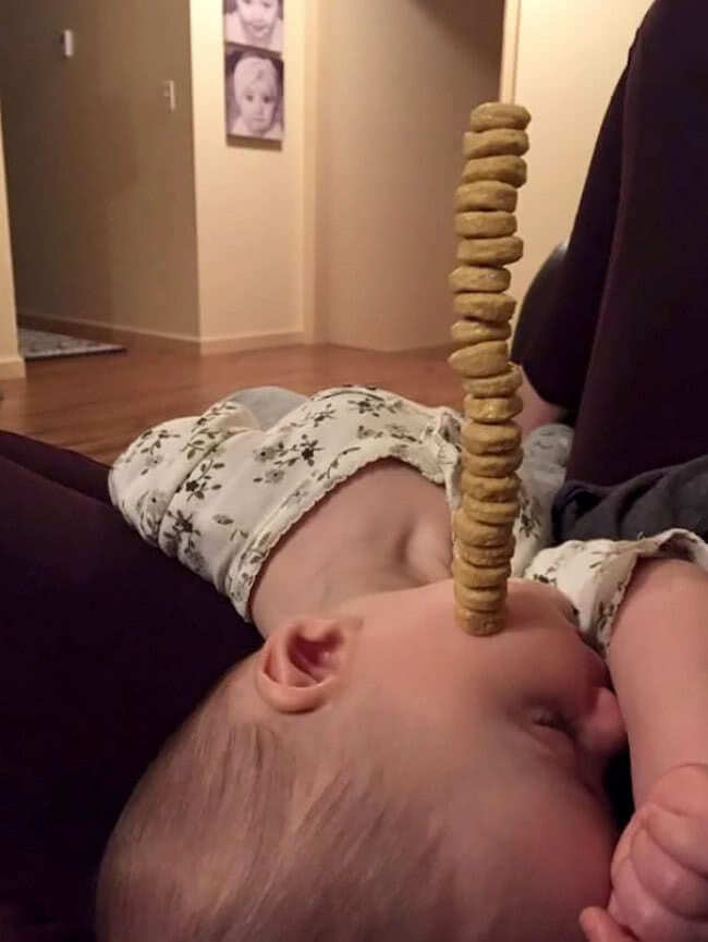 Gisteren was het natuurlijk Vaderdag en behalve verwend worden door hun kind, ging er ook een competitie viraal. (Ik bedoel: het blijven toch mannen, alles is een wedstrijd, right? ;-)) De blog Life of Dad postte bovenstaande foto van een slapende baby met 5 ‘cheerios’ op de neus met de vraag: hoeveel kun jij er stapelen? #cheeriochallenge. En dat lieten de volgers zich geen twee keer zeggen… Het resultaat: een stel hilarische foto’s die het internet rondgingen met slapende baby’s en torens van ontbijtgranen!