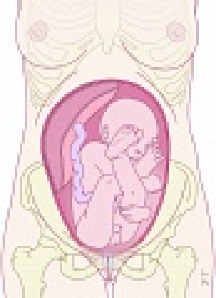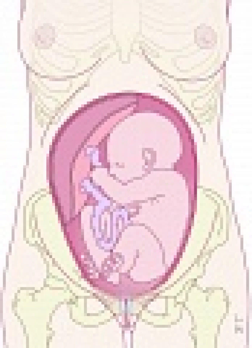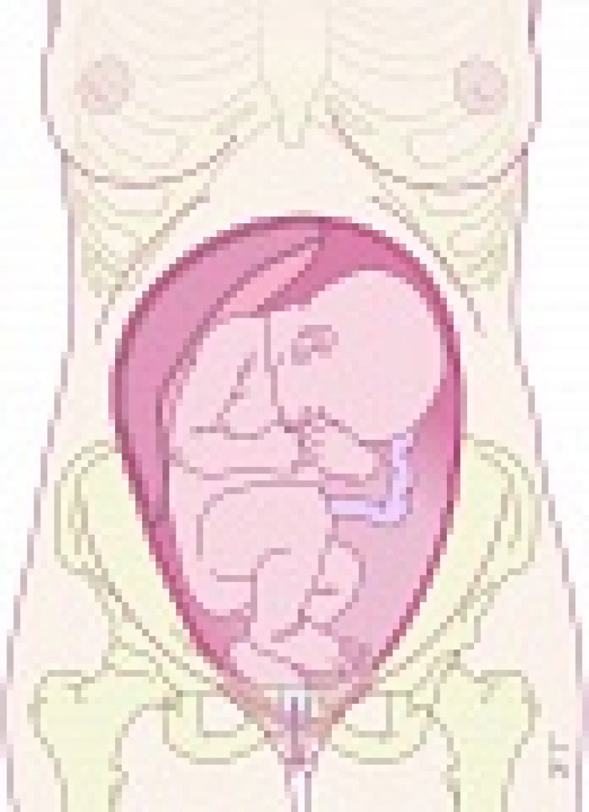 Onvolkomen stuitligging. De baby's benen liggen omhoog naast het lichaam, zodat de baby als het ware op zijn tenen kan sabbelen.