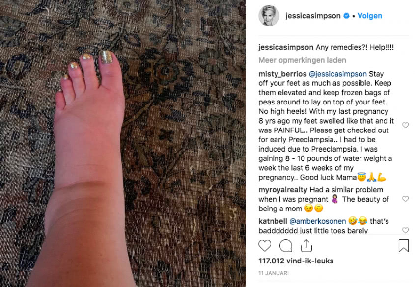Zangeres Jessica Simpson heeft er enorme last van tijdens haar zwangerschap: opgezwollen voeten. Op haar Instagram vraagt ze haar volgers om hulp. Want wat kun je tegen deze vervelende kwaal doen?