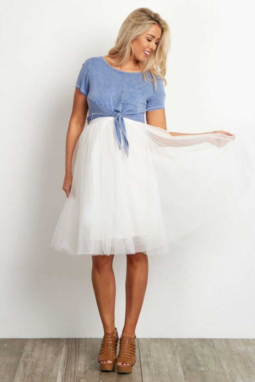 Wat naast leuk ook nog eens een hele handige tip is: draag je graag leuke shirtjes met print maar worden ze te kort aan de voorkant om je zwangere buik helemaal te bedekken? Knoop ze dan op met een knoopje boven buik/onder je borsten en draag er een langer hemdje onder. Dit geeft een tof effect en je buik komt zo prachtig uit.