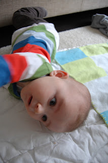 Rollen doe je nu ook steeds meer, alle kanten gaat het op en we moeten nu echt opletten waar je heen gaat. We kunnen je ook echt niet meer op ons bed laten liggen of op de bank! Wanneer je iets ziet liggen rol je er ook echt naar toe. Soms moet je daarvoor een paar insteken of je schuin verplaatsen maar als je dan hebt wat je wil hebben ben je super trots en ga je lekker verder met je favoriete geluidjes maken: rrrrr rrrr rrrrrr. Pappa en mamma zien nu al dat je een sterk willetje hebt! Heerlijk, wij houden daar wel van! Lekker blijven doen en goed je grenzen aan geven, dat is belangrijk! Zitten gaat ook steeds beter en eind van deze maand zit je goed rechtop, zelfstandig een paar minuten. Zittend spelen is dus ook leuk!