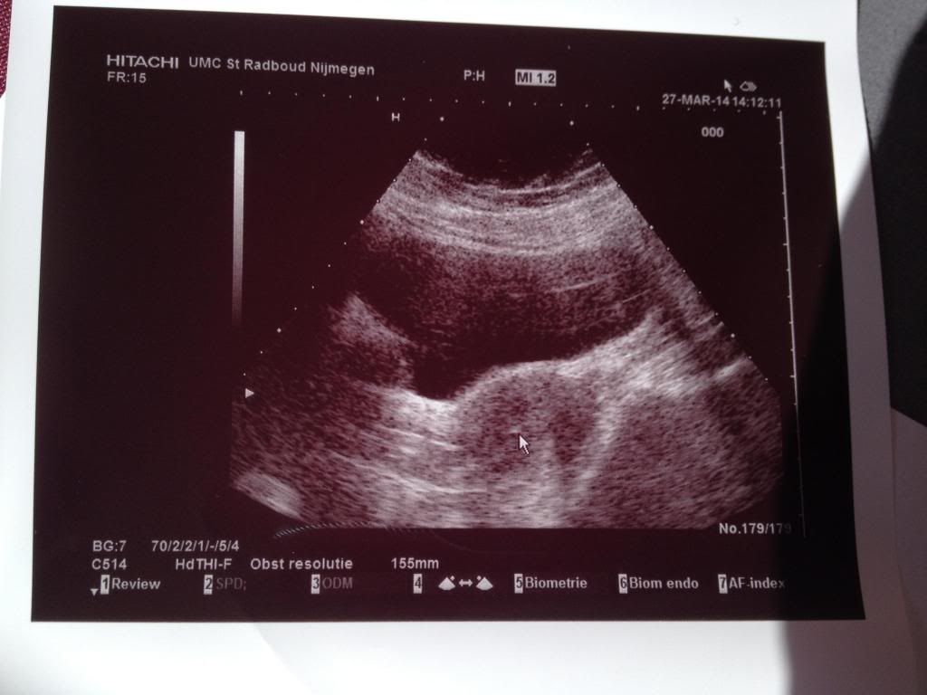 Toen we daar aankwamen waren we 20 minuten te vroeg. Maar ja, beter te vroeg als te laat. We mochten even wachten in de wachtkamer. Toen we precies om 14:00 werden gehaald, toen vroeg ze of ik een volle blaas had. Ja, ik durfde al vanaf 11:00 niet meer te plassen, dus ik had een behoorlijke volle blaas. We kregen meteen de foto van ons embryootje te zien. Wat een schatje, hè? Ik ben nu al dol op m'n kind. Hihi.