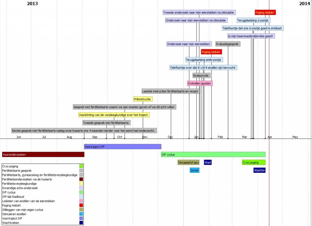 Ik heb een tijdlijn gemaakt over ons traject.Ik vermoed dat het plaatje te groot zal zijn voor de blog (edit: jup, te groot, hier een link naar een groter formaat: klik), maar kan me even niets schelen. Ik heb de tijdlijn gemaakt en dat was best een verwerkingsproces. En confronterend. Ik wilde het eigenlijk in eerste instantie voor mijn vader maken (ik ben een document aan het maken over ons traject, maar ook over uitleg wat bijvoorbeeld een cryo is of hoe het precies met de verzekering zit). Gewoon alles op een rijtje. Maar ik merkte dat het goed voor mij was. Zowel het schrijven van het document als het maken van de tijdlijn. En het is confronterend. In eerste instantie dacht ik bij het schrijven: ik heb best veel geleerd in een korte tijd... maar toen ik de tijdlijn maakte werd ik pas echt geconfronteerd... De eerste onderzoeken waren vorig jaar op 27 mei... over minder als anderhalve maand is het precies een jaar geleden. Dat betekend dat ik bijna een jaar geleden een breekpunt had waarop ik jankend op mijn werk stond omdat ik wéér ongesteld was geworden en toen dat me overkwam (huilen op werk omdat ik ongesteld was geworden) maar besloot om met de huisarts te gaan praten. Bijna een jaar geleden traden we de medische malle molen in...