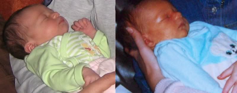 gekk heee??? rechts is mijn neefje 6 dagen oud en zij is 4 dagen oud en het leuke is dat veel mensen altijd denken dat mijn neefje en zusje Broer en zus zijn ... terwijl me zusje op mijn vader lijkt en hij op zijn moeder... en hun zijn geen familie!!! heeel raar allemaal hahaha maar wel heel leuk om te ziennn!!