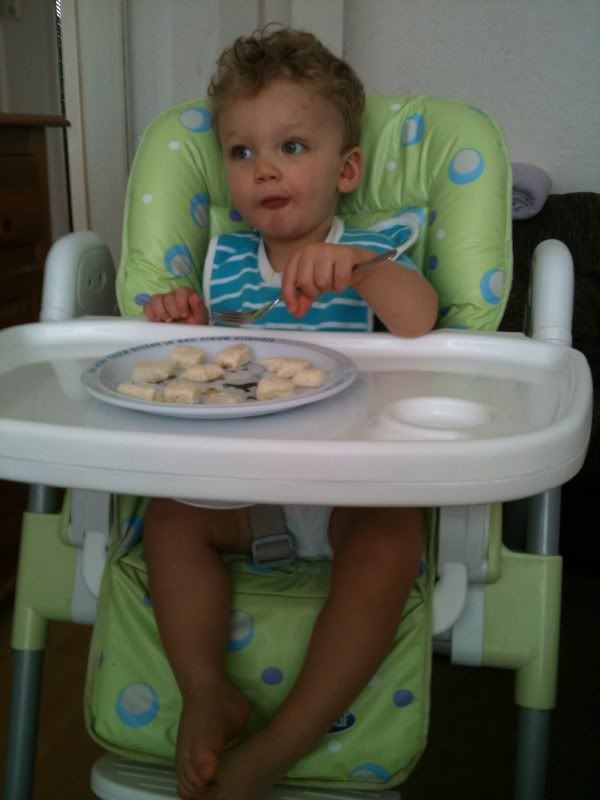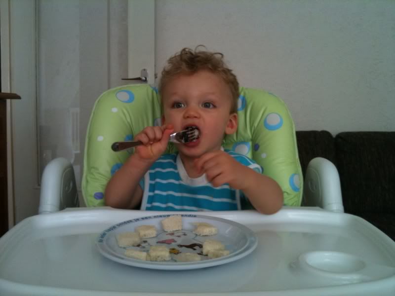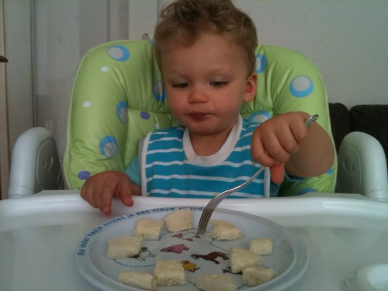 De ene dag is Sami een goede eter, de andere dag krijg ik er bijna niets in. Aangezien hij 's ochtends en 's middags ook moeilijk brood eet, ben ik op zoek gegaan naar alternatieven. Brood in de hand, brood in stukjes op bord en zelf eten met een vork, brood met smeerkaas, jam en zelfs chocopasta en pindakaas. Crackers, pap, ontbijtkoekjes met granen, plakjes ontbijtkoek, LU ontbijtcrackers. Ja, ze zijn allemaal de revue gepasseerd. Zonder enig succes echter, dus nu zijn we weer terug bij het oude vertrouwde broodje. Gelukkig gaat het op sommige dagen wél heel goed.