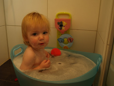Om 17.00 uur had ik een dvd van de Sprookjesboom (Efteling) aangezet en een badje met kussens in de woonkamer gezet en haar fopspeen gegeven. Daar ging ze lekker inliggen.