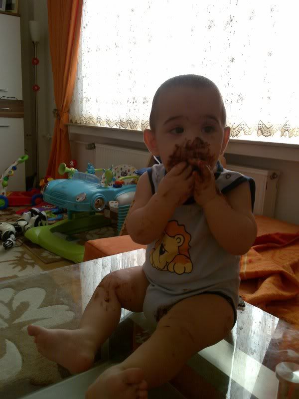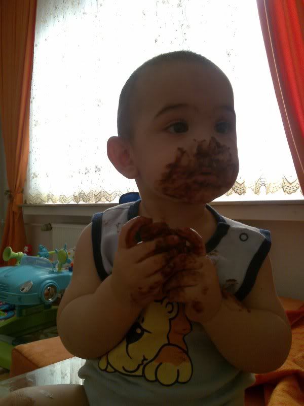 We waren lekker met me man samen tv kijken en een beetje aan het snoepen. Tot we merktten dat halidömer stiekem een koekje had gepakt. En er hellemaaaal eronder zat. Heel me benk vol met hand afdrukjes. En me kleintje heeft ook geleerd om te delen dus hij wou ook aan ons geven waardoor wij er ook hellemaal eronder kwamen te zitten hahaha. Mij man was wel een beetje boos. Hij zat ook hellemaal onder de chocolade Hier krijg je dan zulke beelden van :D...