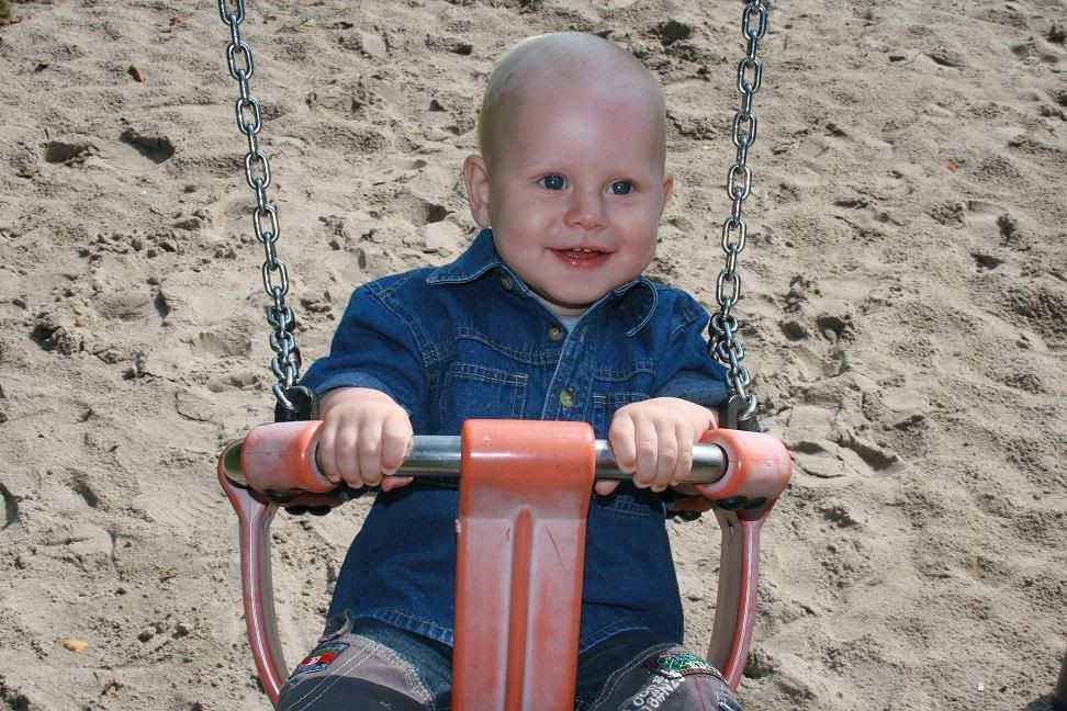 Wij waren vanmorgen met J.ayden aan de wandel ... langs een speeltuintje toen we zagen dat daar ook een kleine kinderen schommel hing, dat gaan we eens proberen met J.ayden ... hij vond het SUPER !! Hij lag helemaal dubbel van het lachen, bij deze dus even een foto :