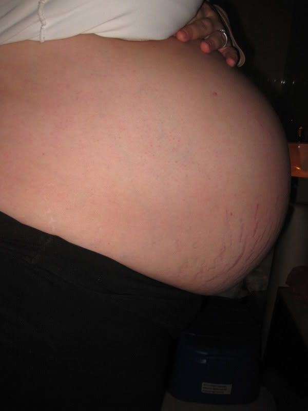 Hier dan nog eens een buikfoto. Was alweer effe geleden en wat is die toeter weer gegroeid zeg!!! De striemen die op mijn buik te zien zijn, zijn er van de vorige zwangerschap. Ik heb er deze keer nog geen enkele nieuwe bij, waar ik dus heel erg blij van ben. Nog een dikke maand en dan mag ik weer bye bye zeggen tegen mijn dikke buik. Zal het toch wel weer missen, dat getrappel en gewriemel in mijn buik, maar de kwaaltjes niet zo...