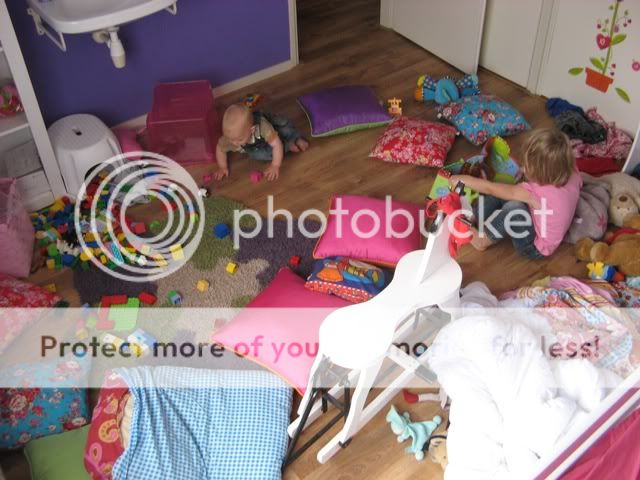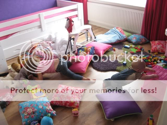 Onderstaande foto is vorig week gemaakt. Ik was de kast van Mick aan het uitzoeken en hij en Dena waren op Dena’s kamer aan het spelen. Ze hadden allebei de grootste lol en ik besloot even een intiem, grote zus speelmomentje op de gevoelige plaat te leggen. Ik dus met het fototoestel richting de kamer van Dena. Ze zijn hooguit 5 minuten alleen geweest en de volgende foto's heb ik kunnen schieten…..
