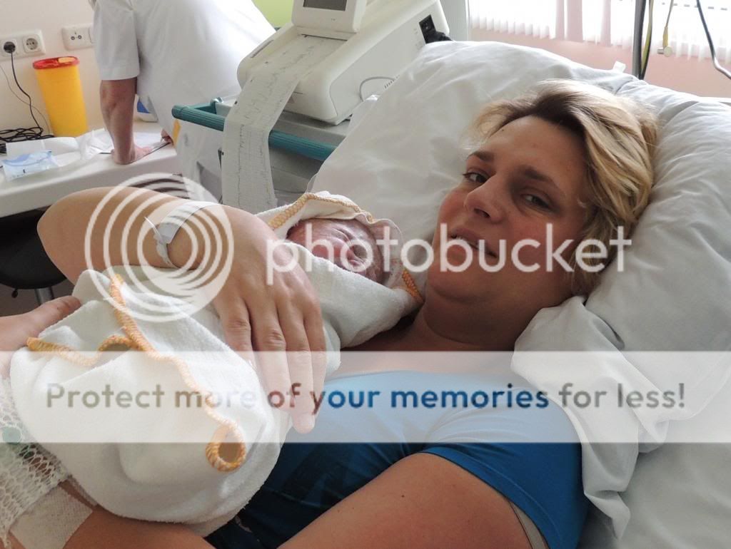 Donderdagmorgen: om 8.15 zijn mijn vliezen gebroken. Wat een waterval kwam daar al bij vrij. Na een half uurtje hebben ze de laagste stand weeopwekkers toegediend. Nou dat was voldoende. In no-time zat ik een weeënstorm en raakte ik ook weer heerlijk in paniek. Ik had aangegeven een ruggeprik te willen, maar er werd mij gezegd dat ze dat niet aandurfden in verband met mijn litteken in mijn buik en mijn totaalruptuur litteken. Ik heb wel een prikje in mijn been gekregen om de scherpe kantjes eraf te halen. Dat was voldoende. Ik kon me weer “ontspannen” Al heel snel zat ik toen op 10 cm en om 14.30 mocht ik gaan meepersen.