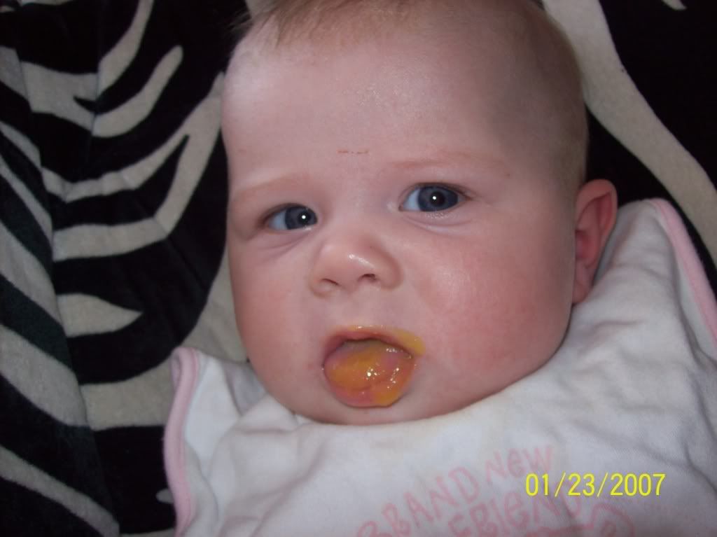 Ze eet af en toe een paar hapjes fruit die ik zelf voor haar maak. (tot nu toe gehad appel, banaan, mango, peer en af en toe twee van die door elkaar. owja en 1 potje banaan/appel/aardbei van nestle voor als ik geen tijd kan maken voor haar hapje en ik het vergeten ben uit de vriezer te halen bv..) Ze spuugt sinsdien wel minder trouwens!