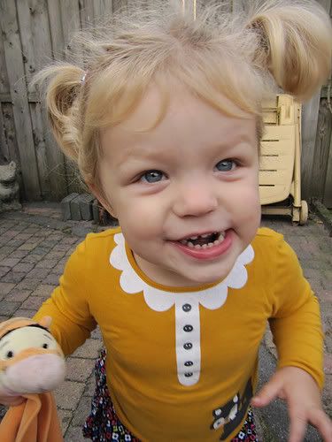Met Mila gaat alles goed, het is echt een kleine meid geworden. Praat de oren van je lijf af, ook met zinnetjes nu en ze telt gewoon tot 20! Wow! Ze is helemaal van het buitenspelen en dan vooral de schommel is favoriet... we hebben hier een speeltuin voor de deur dus dat komt mooi uit hahahha... Verder heeft ze een obsessie met lantaarnpalen, ze vindt het prachtig als het 's ochtends nog donker buiten is en ze zijn aan. Als ze overdag uit zijn dan is het constant van "mama aanzetten". Heb al 1000x uitgelegd dat mama dat niet kan doen hahaha... Ach ja... Ze slaapt tegenwoordig in een meegroeibedje en vind het helemaal leuk, ze is er alleen van de week uitgevallen maar voor de rest gaat het hardstikke goed. Ze komt er eigenlijk ook niet uit, hoor haar nooit lopen en als ze wakker wordt dan roept ze meestal en als ik dan de deur open doe zit ze nog in bed...